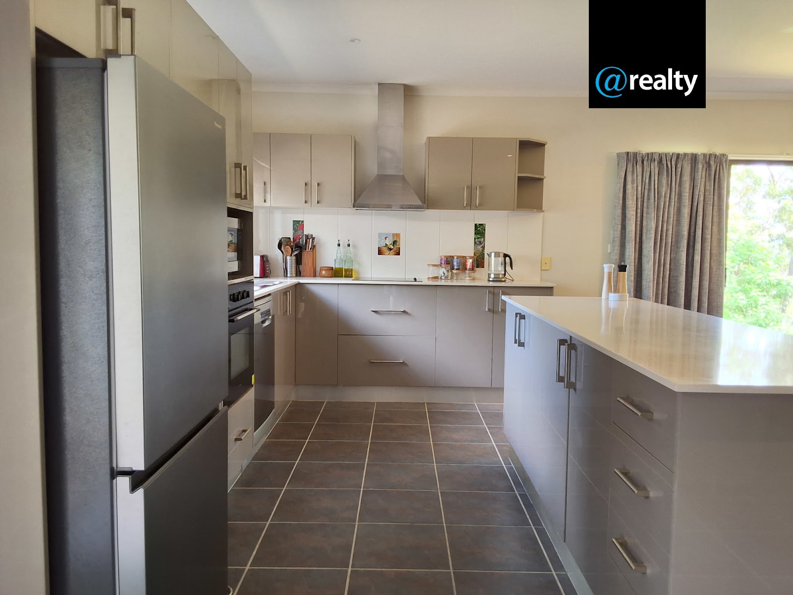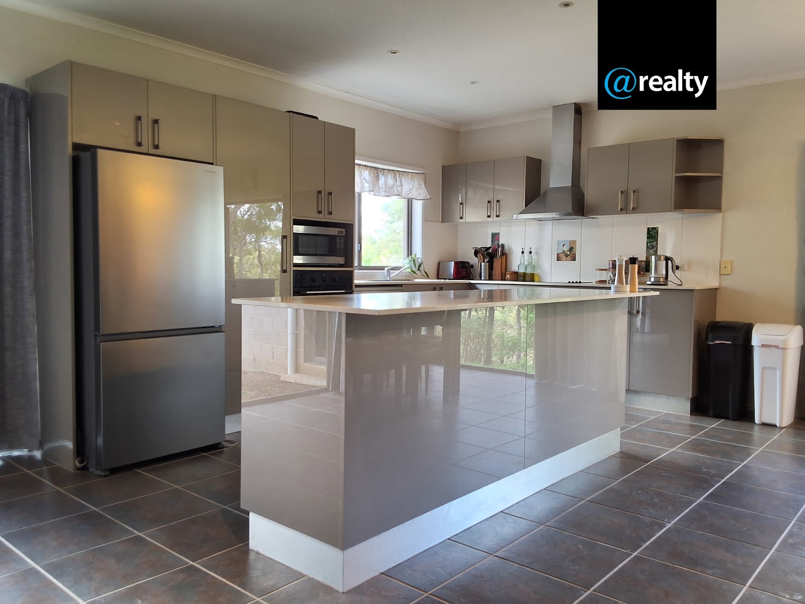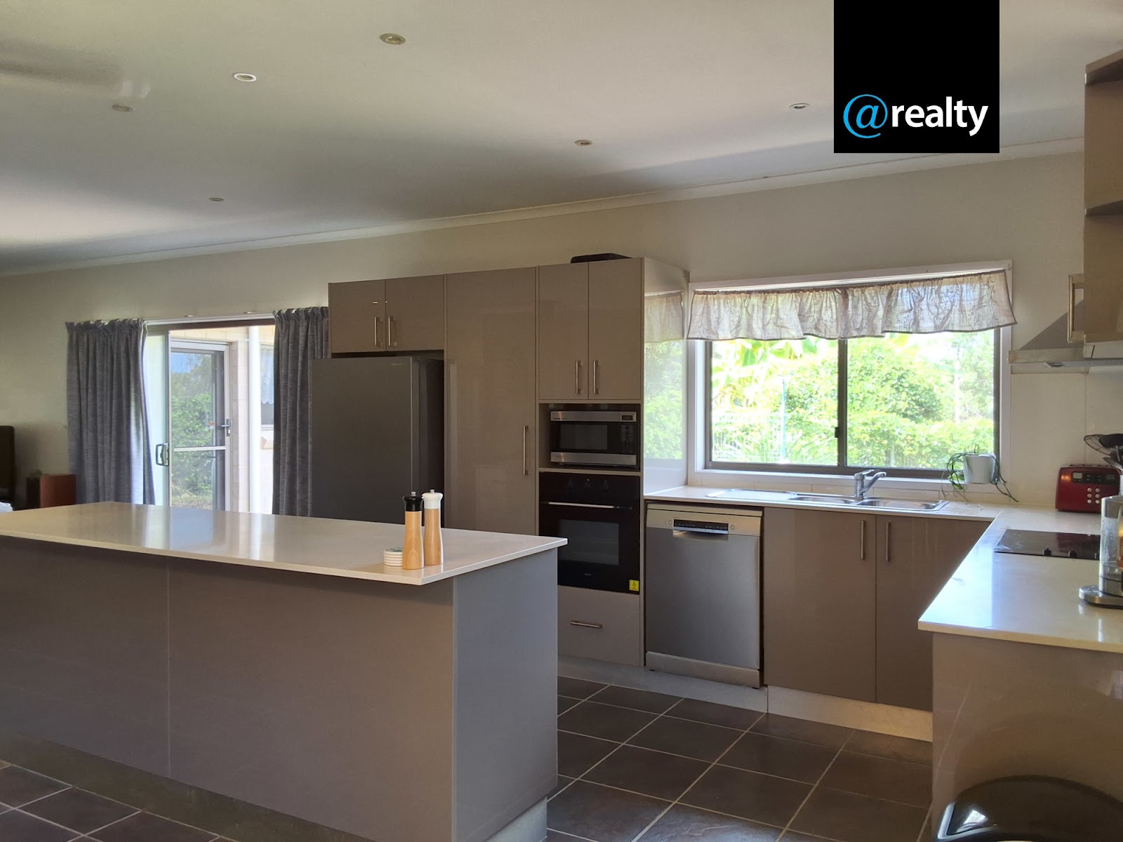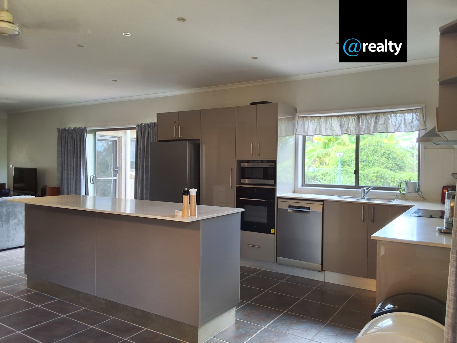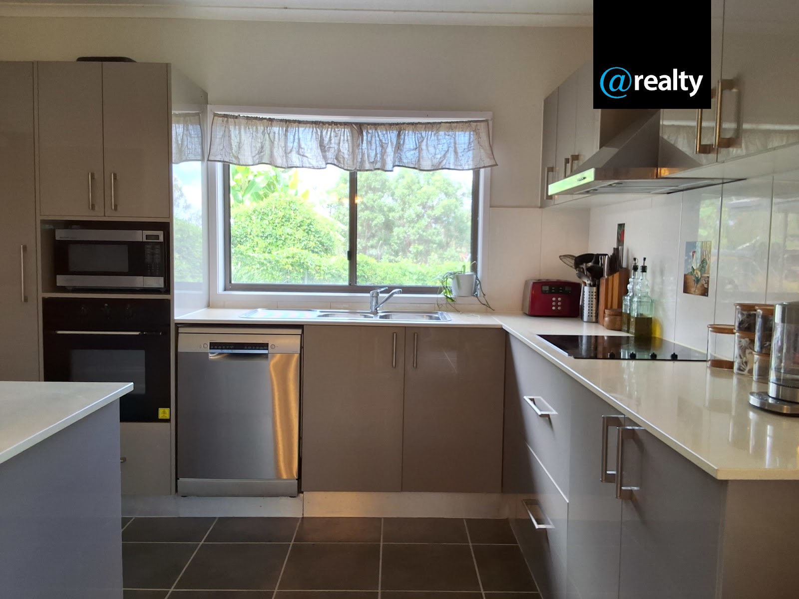 The kitchen is modern with a large Caesar Stone island bench, all benches are Caesar Stone and are above standard height, there is plenty of cupboard space. It has an electric benchtop stove and rangehood, with an inbuilt electric oven and a new Bosch dish washer.